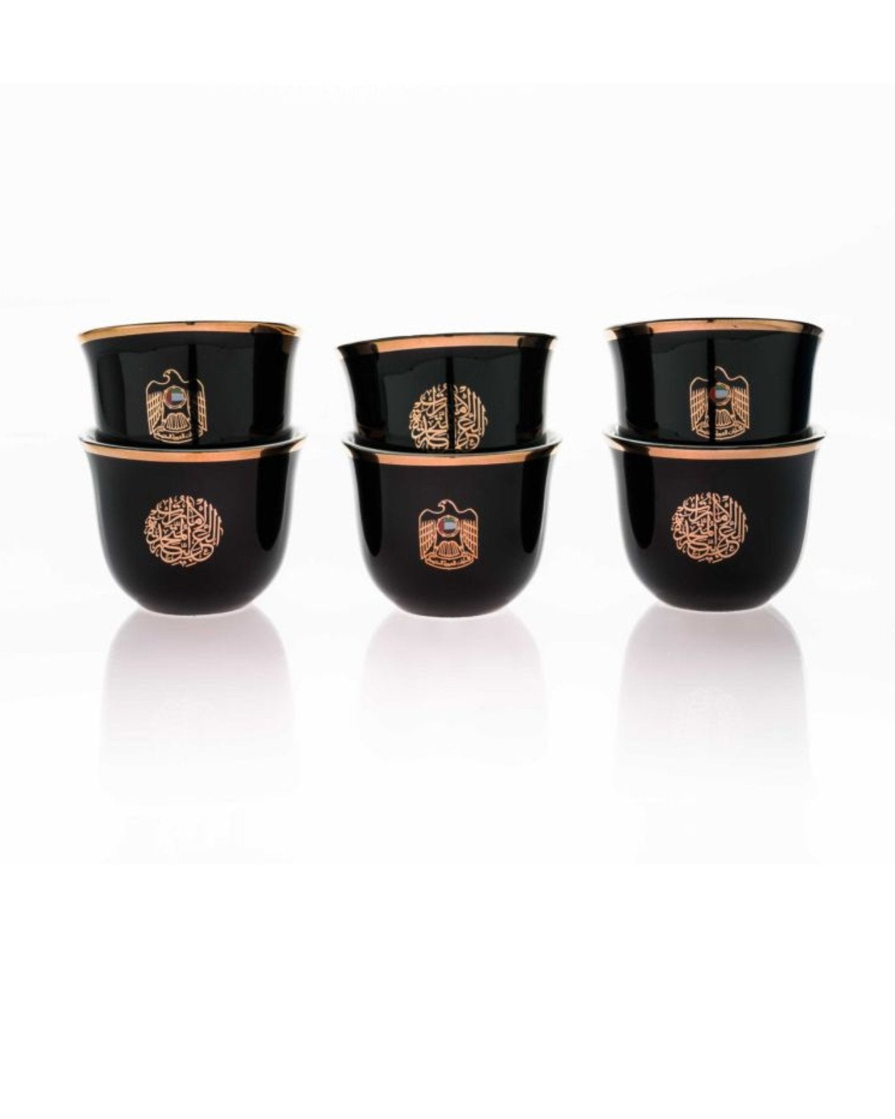 طقم سيراميك أبيض وأسود، يتكون من كوب قهوة بتصميم مميز مطبوع عليه شعار الدولة على زاوية الكوب. يأتي مع ستة أكواب بنفس التصميم.