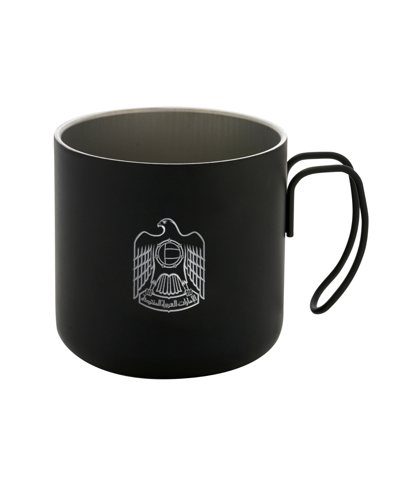كوب معزول من الفولاذ المقاوم للصدأ، مزدوج الجدار، مطلي، بمقبض سلكي على شكل أذن. شعار علامتنا التجارية محفور في الأسفل، وشعار دولة الإمارات العربية المتحدة على الجانب، مع إمكانية تخصيص الشعار أو الاسم على الكوب.
