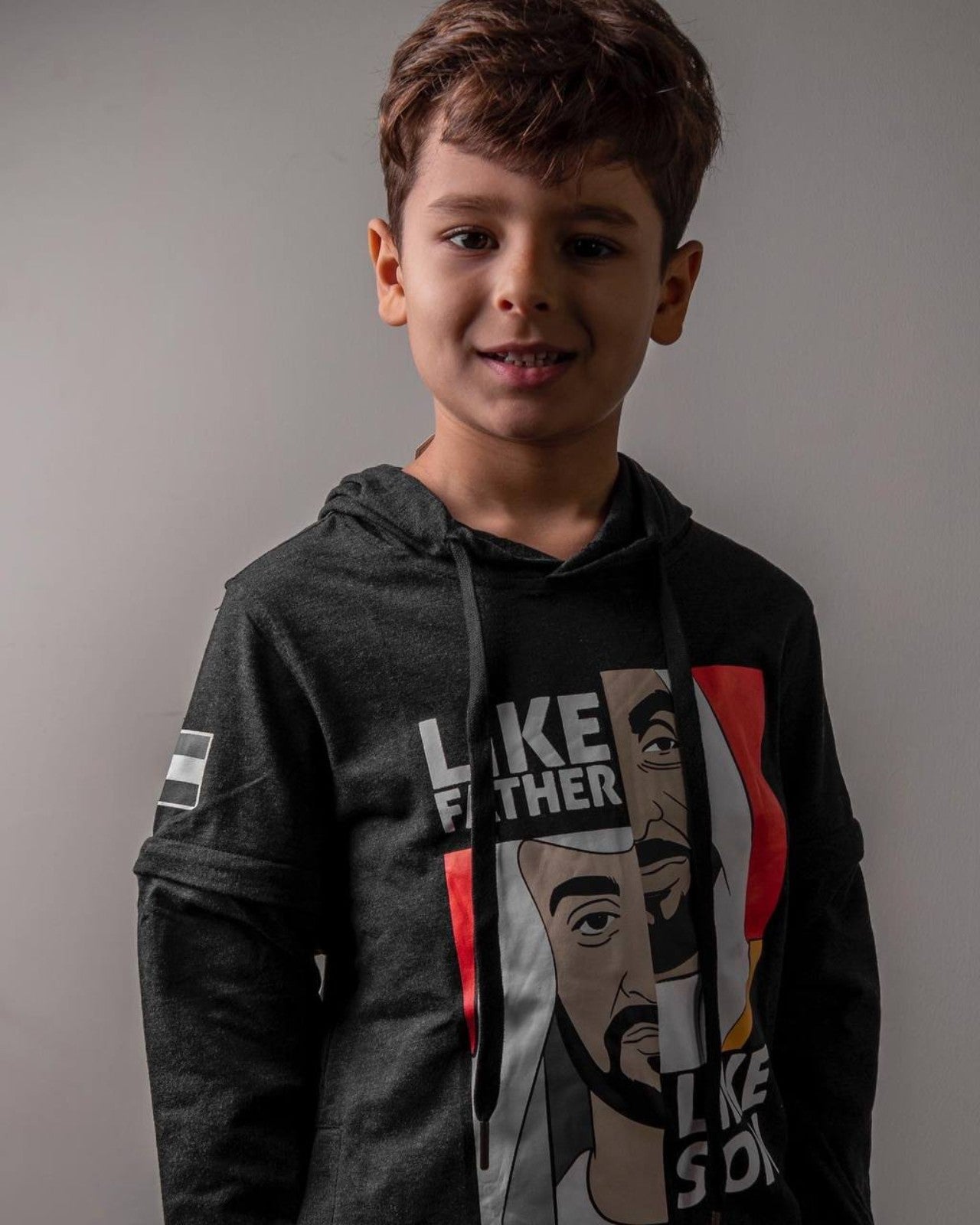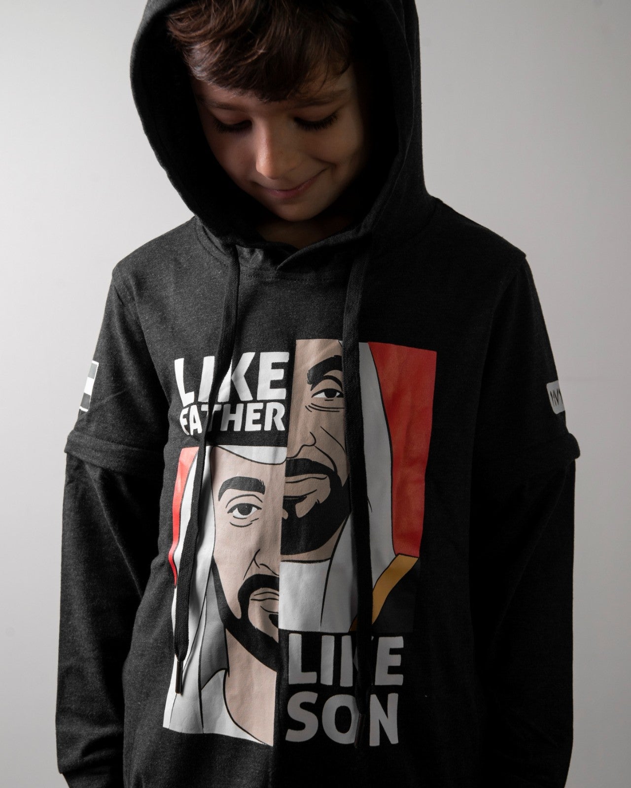 هودي أسود مطبوع عليه صورة مميزة للشيخ زايد بن سلطان آل نهيان والشيخ محمد بن زايد آل نهيان على الظهر.