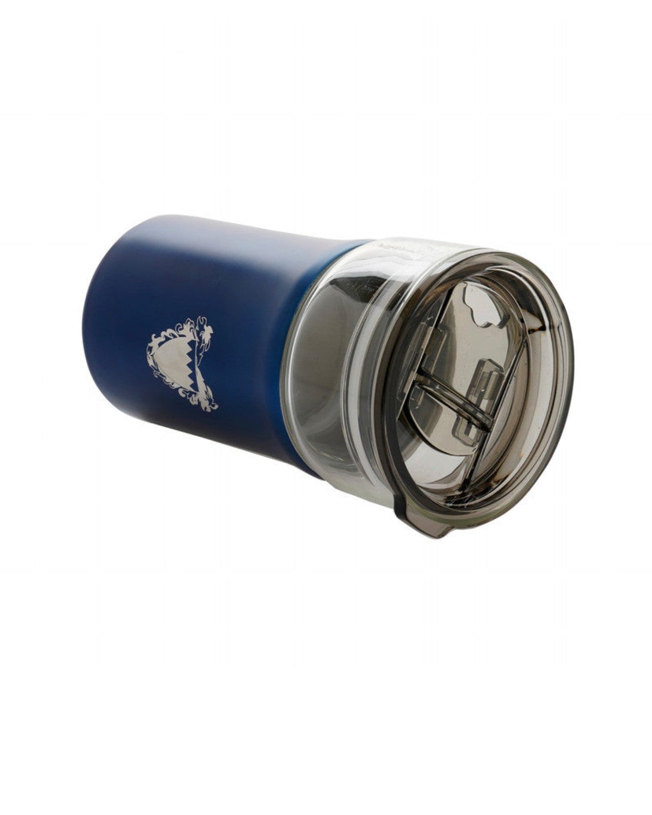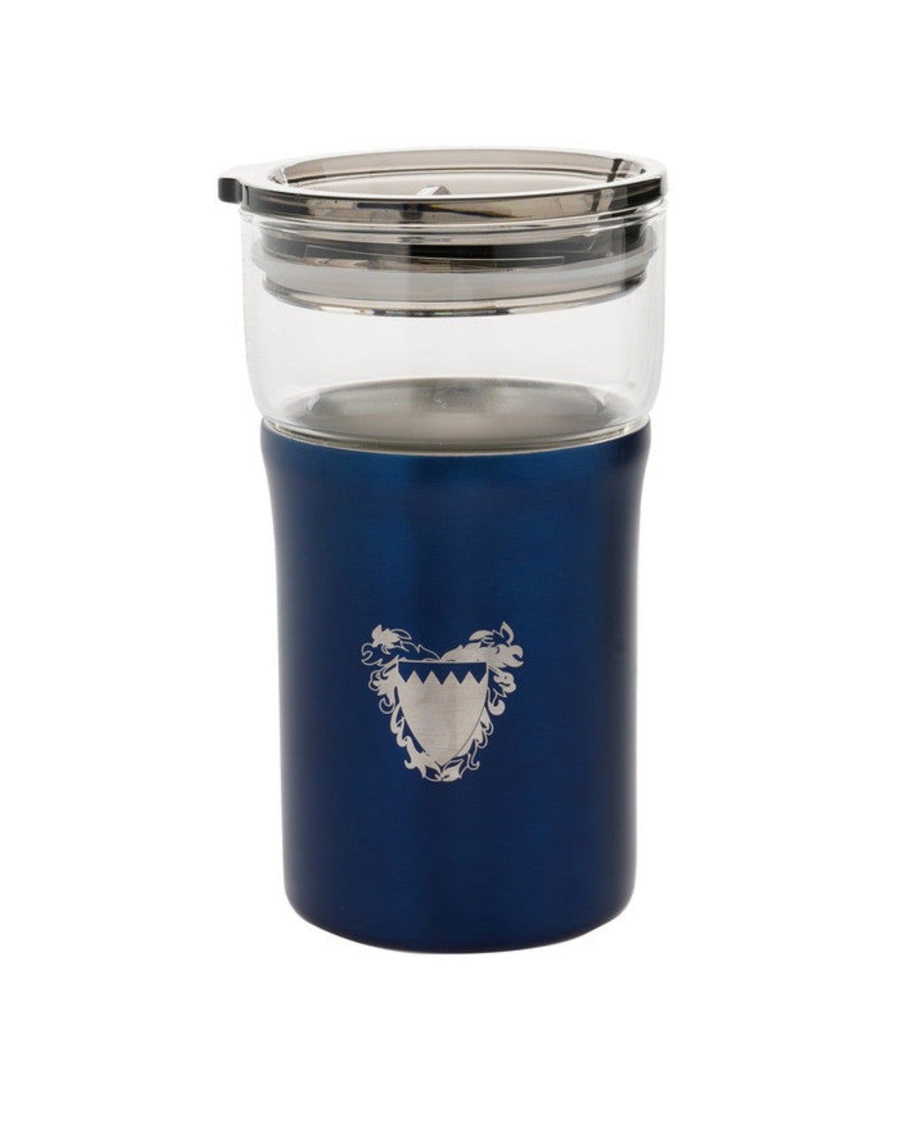 كوب زجاجي متين معزول حرارياً مع طبقة خارجية من الفولاذ المقاوم للصدأ باللون الأزرق مع شعار البحرين للدولة محفور على الجانب وخيار تخصيص الشعار أو الاسم على الجانب الآخر.