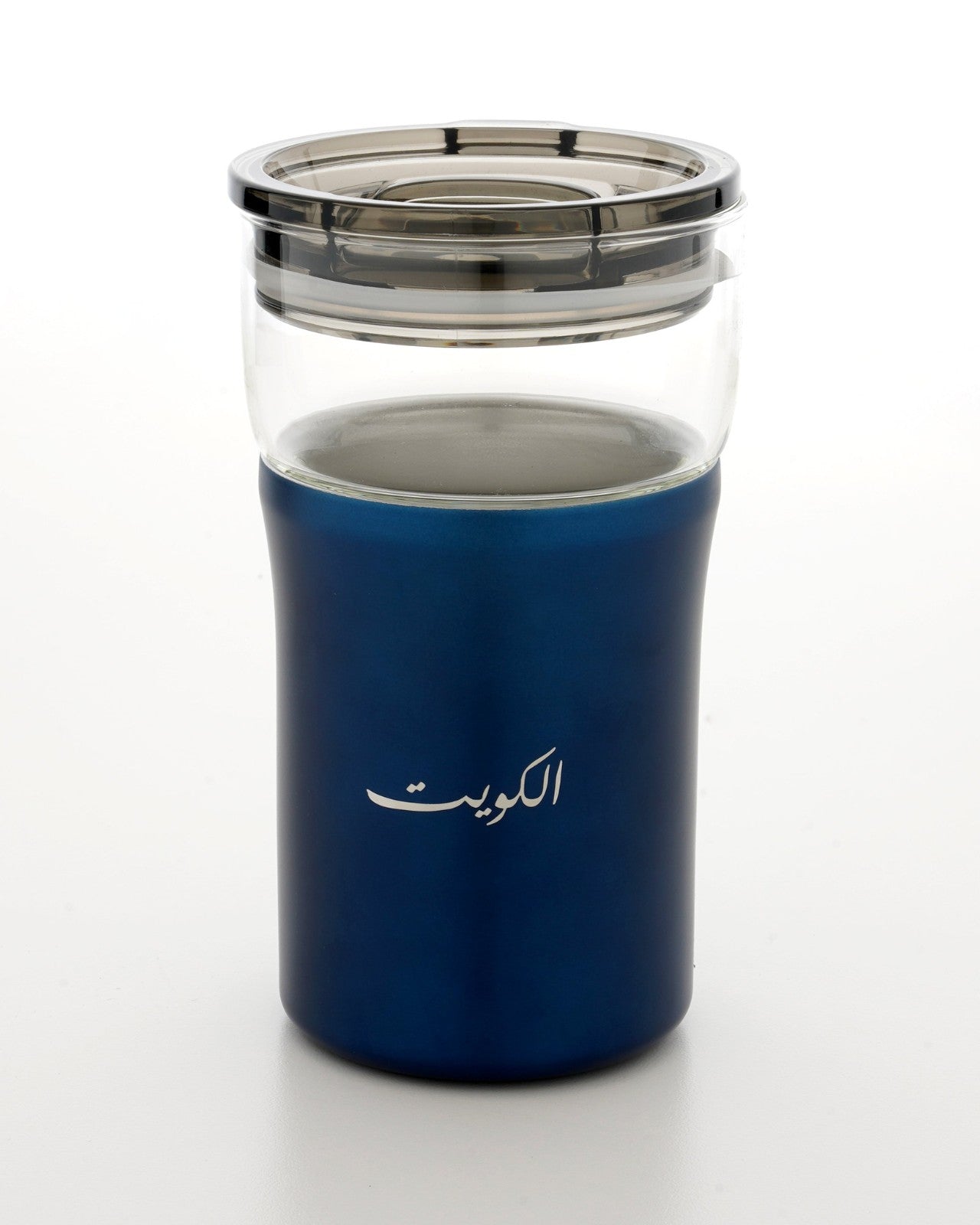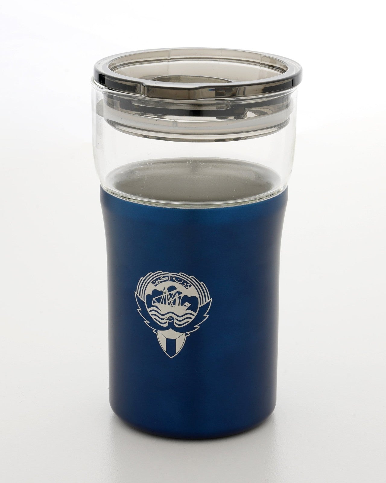 كوب زجاجي متين معزول حرارياً مع طبقة خارجية من الفولاذ المقاوم للصدأ باللون الأزرق مع شعار الكويت محفور على الجانب وخيار تخصيص الشعار أو الاسم على الجانب الآخر.