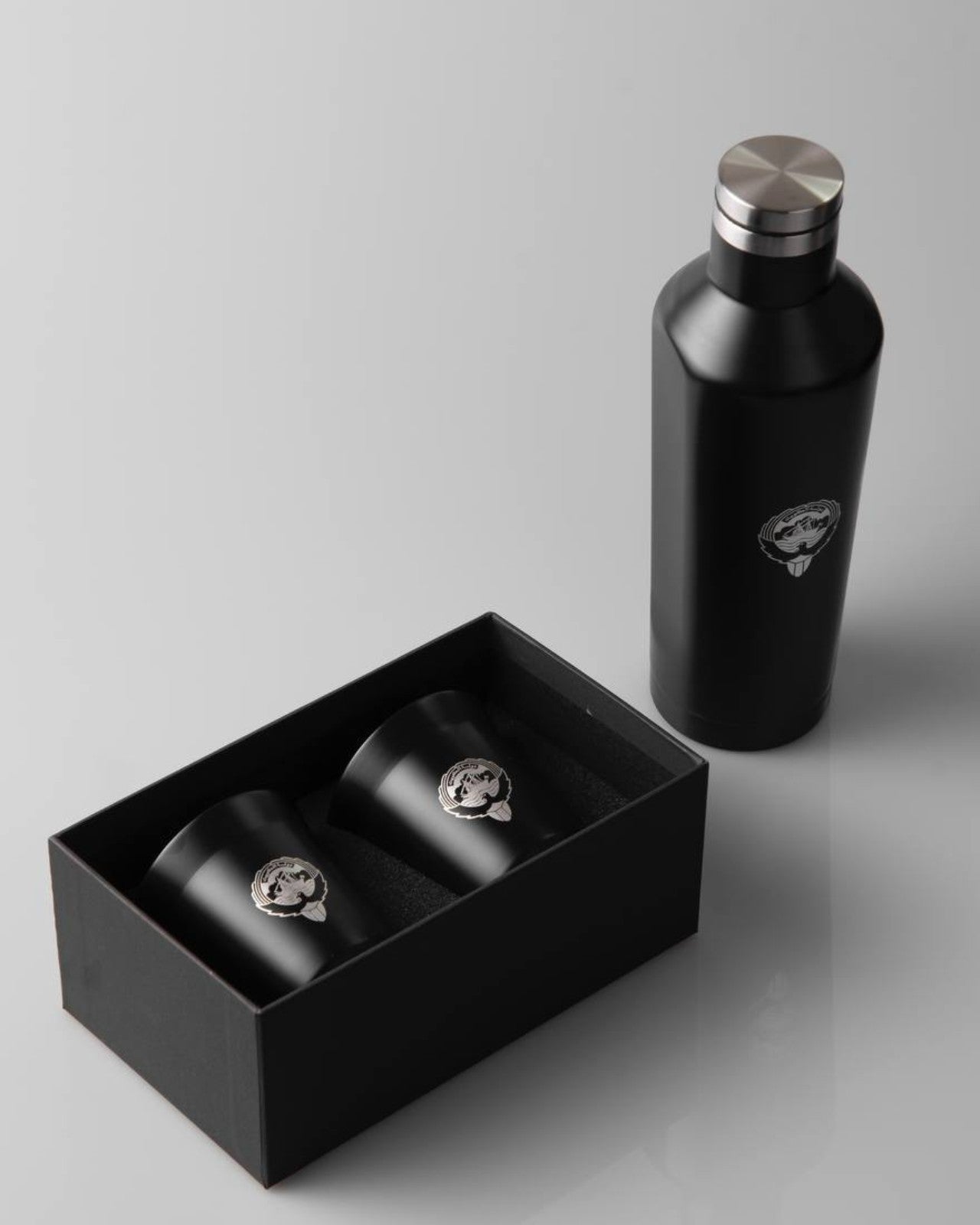 زجاجة ماء من الفولاذ المقاوم للصدأ، مطبوع عليها شعار الولاية على جانبها وشعار KW على الجانب الآخر. غطاء أسود قابل للإزالة من القماش مطبوع عليه شعار KW. طقم من كوبين مطليين ومعزولين حراريًا من الفولاذ المقاوم للصدأ، مع شعار علامتنا التجارية محفور في الأسفل وشعار KW على الجانب.