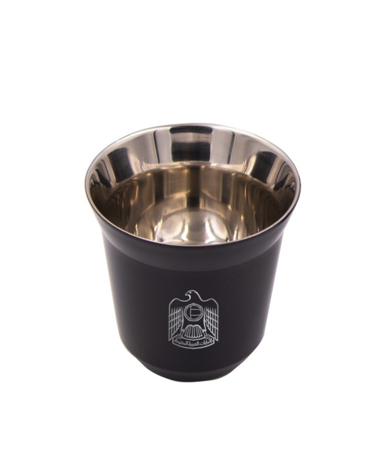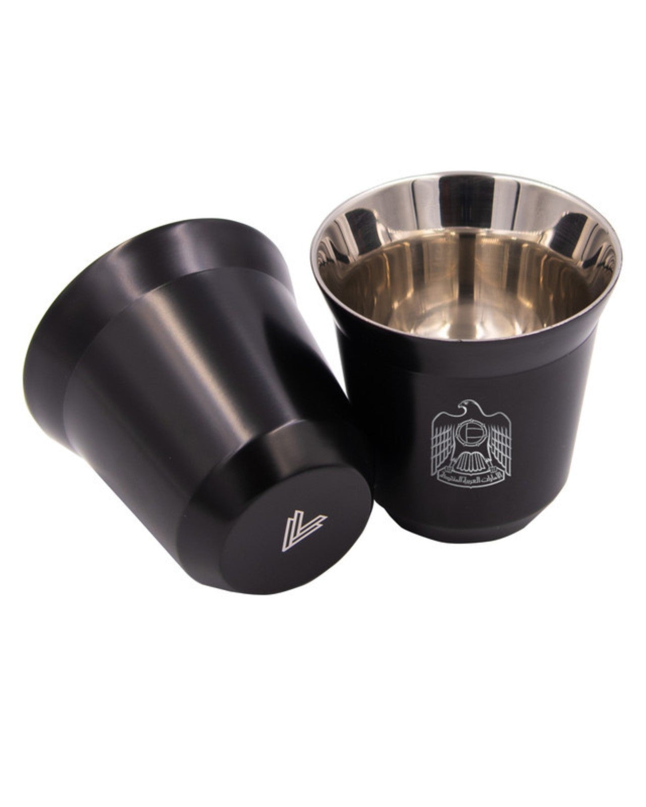 طقم من كوبين مطليين ومعزولين حراريًا من الفولاذ المقاوم للصدأ، مع شعار علامتنا التجارية محفورًا في الأسفل وشعار دولة الإمارات العربية المتحدة على الجانب. إمكانية تخصيص الشعار أو الاسم على الكوب متاحة.