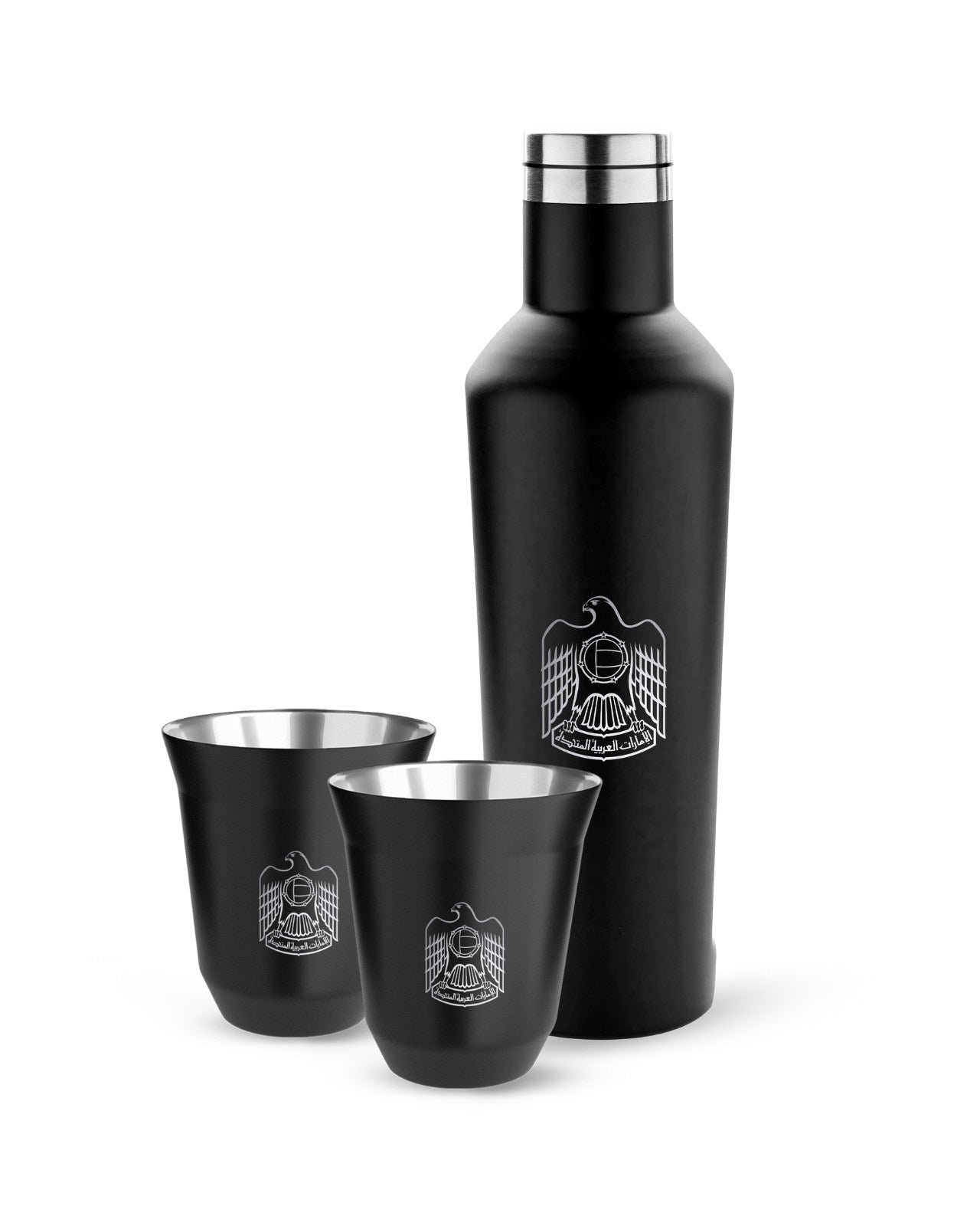 زجاجة ماء من الفولاذ المقاوم للصدأ، مطبوع عليها شعار الدولة على جانبها وشعار الإمارات العربية المتحدة على الجانب الآخر. غطاء أسود قابل للإزالة من القماش مطبوع عليه شعار الإمارات العربية المتحدة. طقم من كوبين مطليين ومعزولين حراريًا من الفولاذ المقاوم للصدأ، مع شعار علامتنا التجارية محفور في الأسفل وشعار الإمارات العربية المتحدة على الجانب.