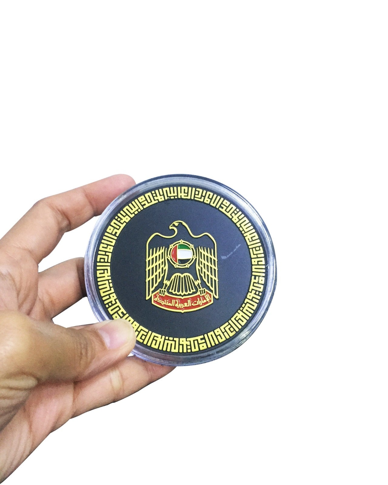 | عملة تذكارية من المعدن الأسود والذهبي تحمل شعار دولة الإمارات العربية المتحدة بتصميم ثلاثي الأبعاد مميز. |