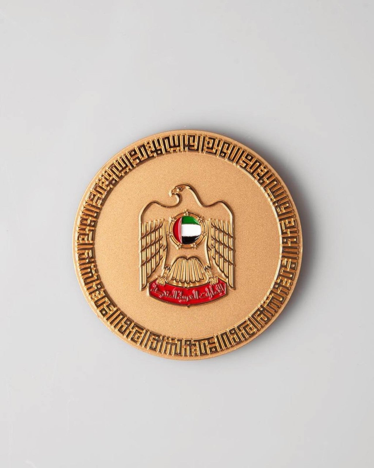 عملة معدنية صلبة تحمل شعار دولة الإمارات العربية المتحدة بتصميم ثلاثي الأبعاد مميز. الوجه الأمامي: شعار الدولة، الوجه الخلفي: شعار دولة الإمارات العربية المتحدة دائري وإطار دائري بارز (الإمارات العربية المتحدة).