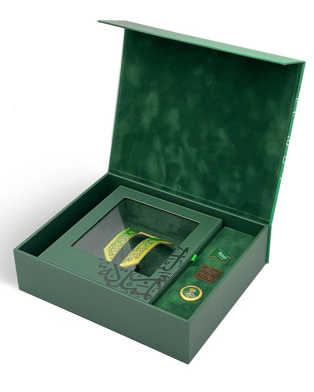 وشاح معدني بإطار جلدي أخضر، مُقدّم داخل علبة ورقية مميزة تحتوي على ثلاث شارات خاصة باليوم الوطني، مع وشاح مخملي سعودي. الشارات المرفقة هي: شارة المربع الذهبي للمملكة العربية السعودية، شارة النخلة، وشارة علم المملكة العربية السعودية.