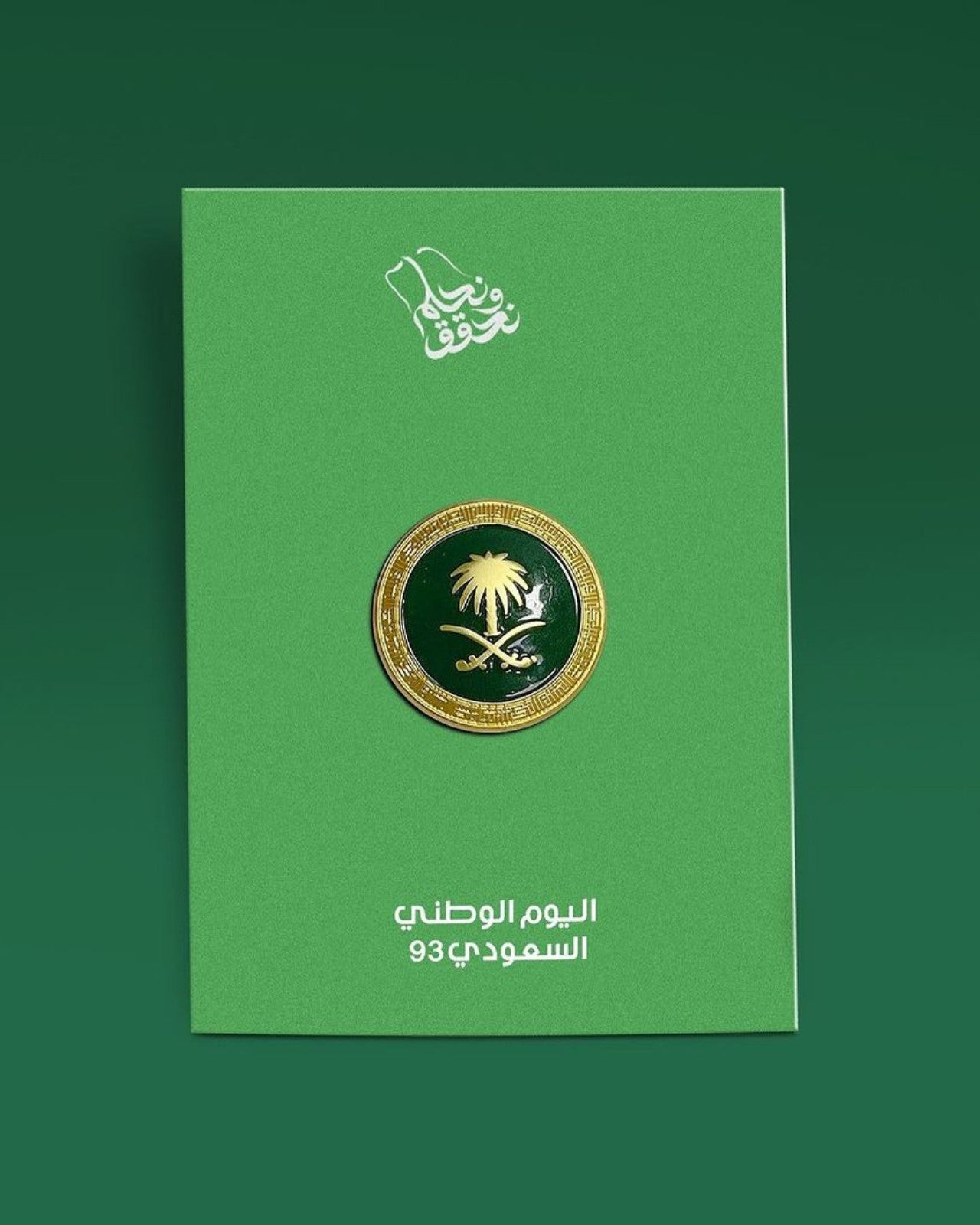 شارة مغناطيسية معدنية صلبة باللون الأخضر مع شعار المملكة العربية السعودية باللون الذهبي بقطر 30 ملم.
