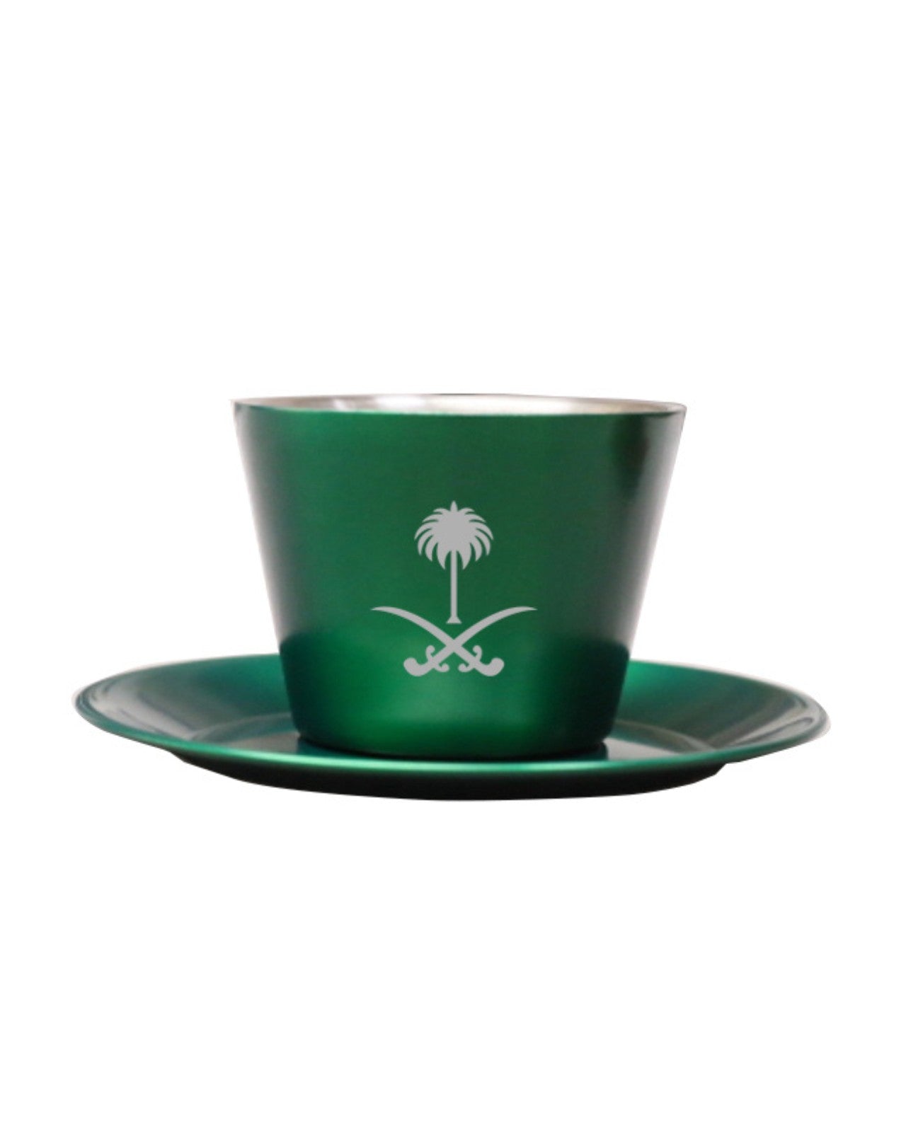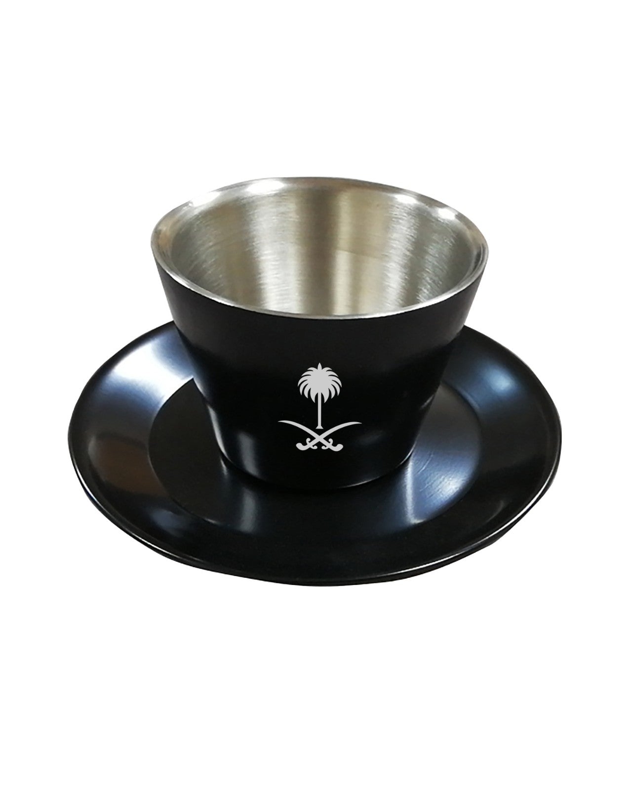 طقم أكواب من الفولاذ المقاوم للصدأ، مكون من ثلاث قطع، مطلي بجدار مزدوج، معزول حراريًا، مع صحن من الفولاذ المقاوم للصدأ وملعقة صغيرة. شعار المملكة العربية السعودية محفور على جانب الكوب، وشعار علامتنا التجارية محفور أسفل الكوب والصحن. يمكن تخصيص الشعار أو الاسم على الجانب الآخر.