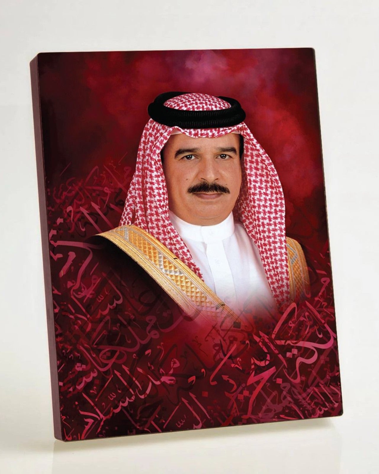 ساعة رقمية بإطار خشبي وخلفية باللون العنابي تحمل صورة صاحب السمو حمد بن عيسى آل خليفة.