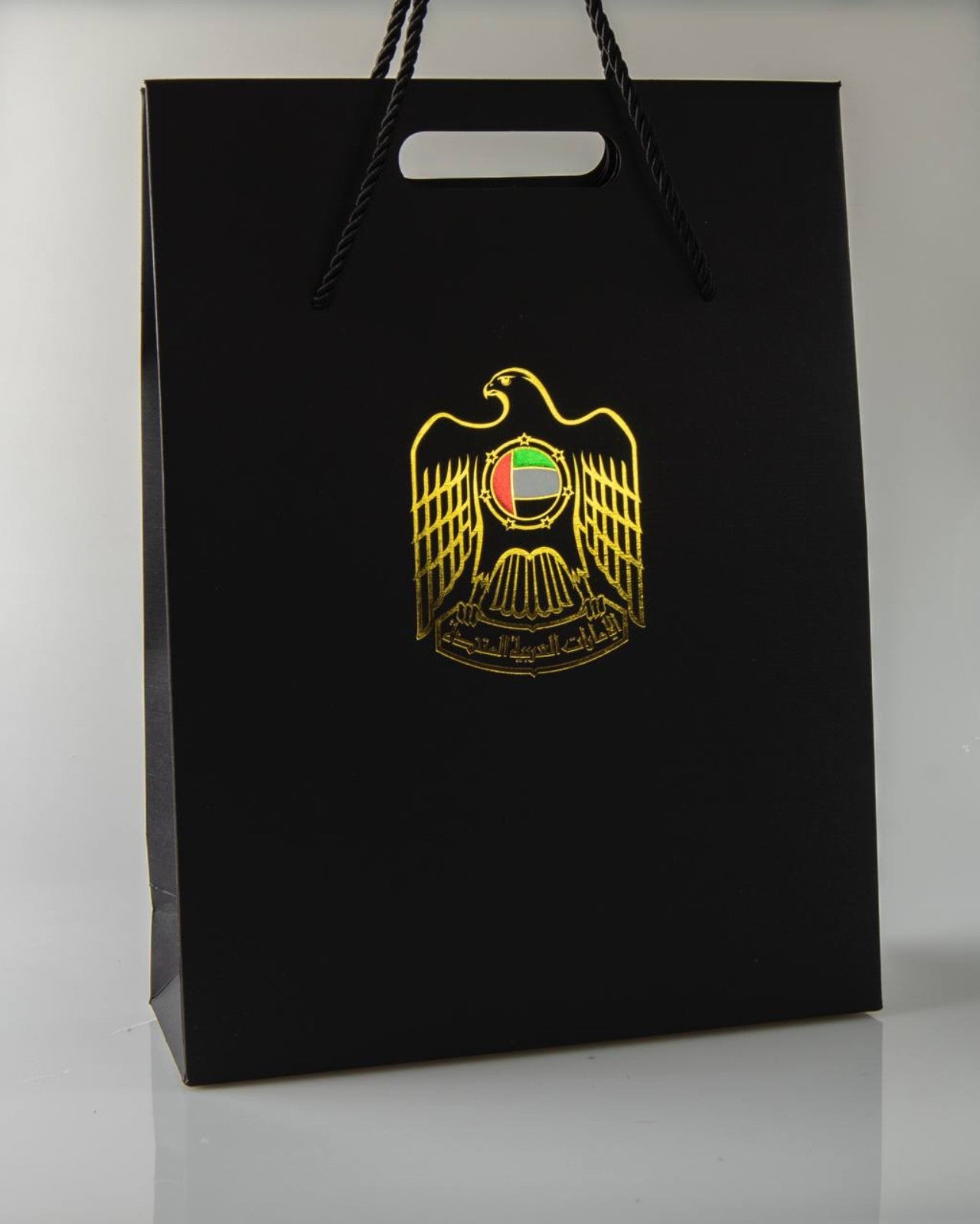 حقيبة هدايا ورقية سوداء تحتوي على وشاح مخملي فاخر وقلم وعملة معدنية وشعارات خاصة (علم الإمارات العربية المتحدة وشعار الإمارات العربية المتحدة).