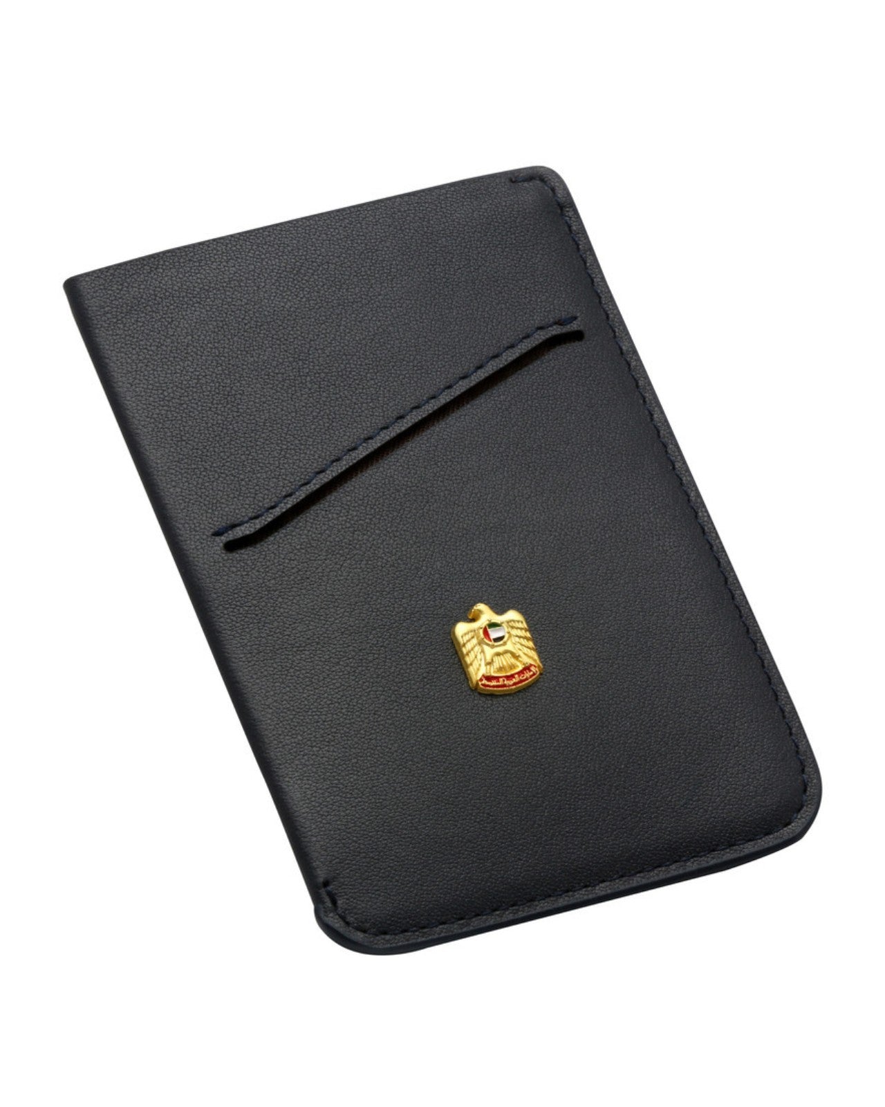 حافظة بطاقات رجالية من جلد كريزي هورس الأصلي، لونها أزرق داكن، تحمل شعار دولة الإمارات العربية المتحدة المعدني من الأمام، واسم الإمارات العربية المتحدة منقوشًا من الجهة الأخرى. تحتوي كل محفظة على فتحة لبطاقة الائتمان، وحاملة علوية لسهولة حمل النقود أو البطاقات.