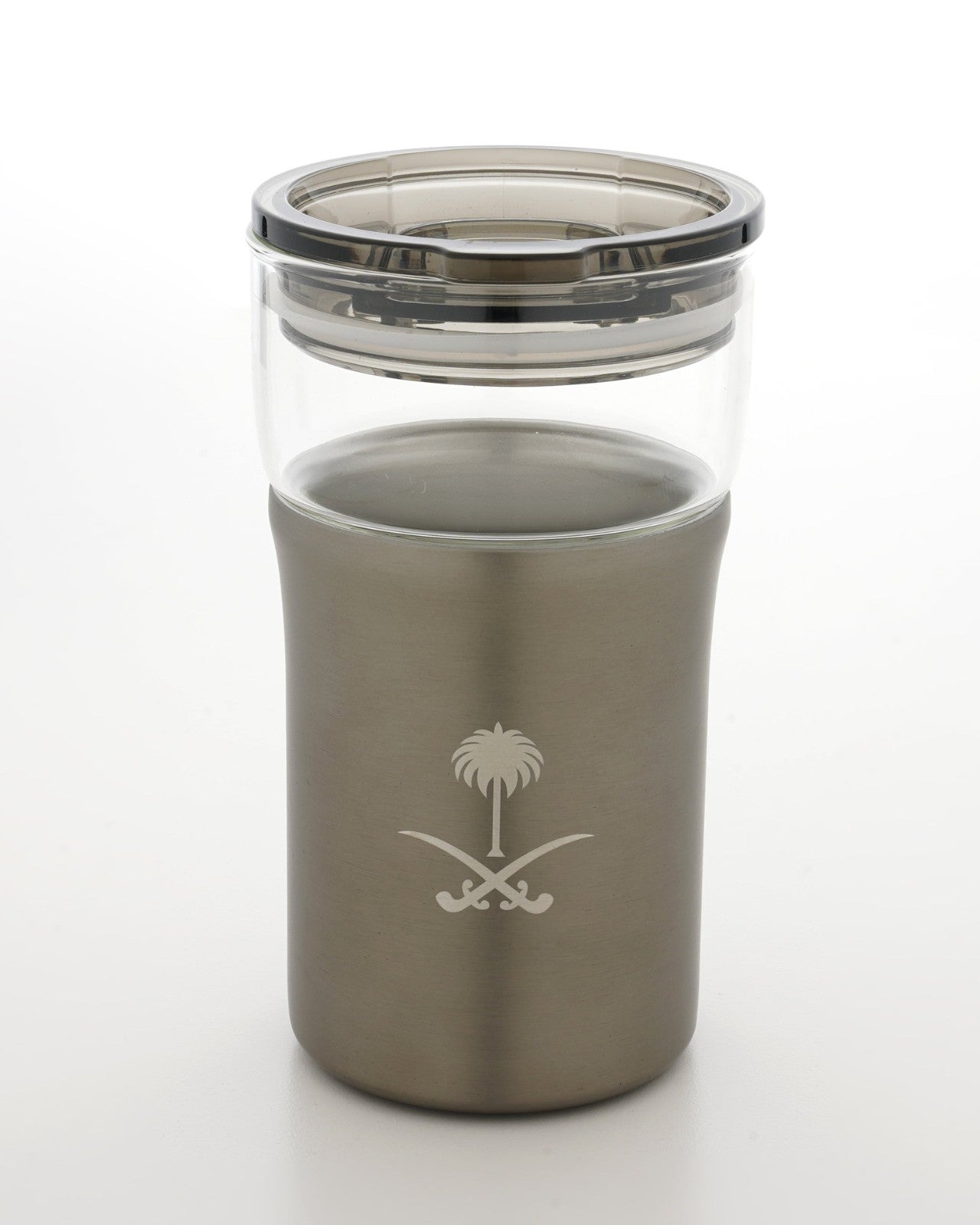 A heat sealed solid glass take away mug with an outer heat-insulated stainless steel layer with engraved KSA logo of the state on the side and an option of logo or name customization on the other.