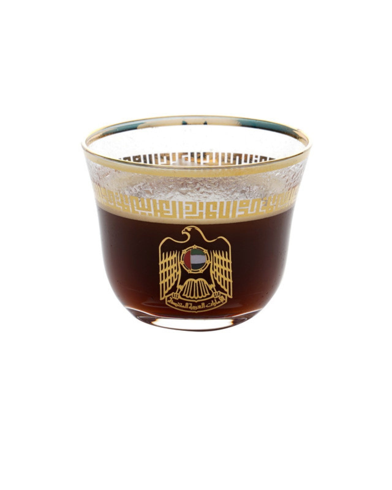 A set of six glass heat resistant cups with smooth cup mouth and trasparent body. A handmade arabic coffee cup with gold logo of the state printed on the side and United Arab Emirates on the other.