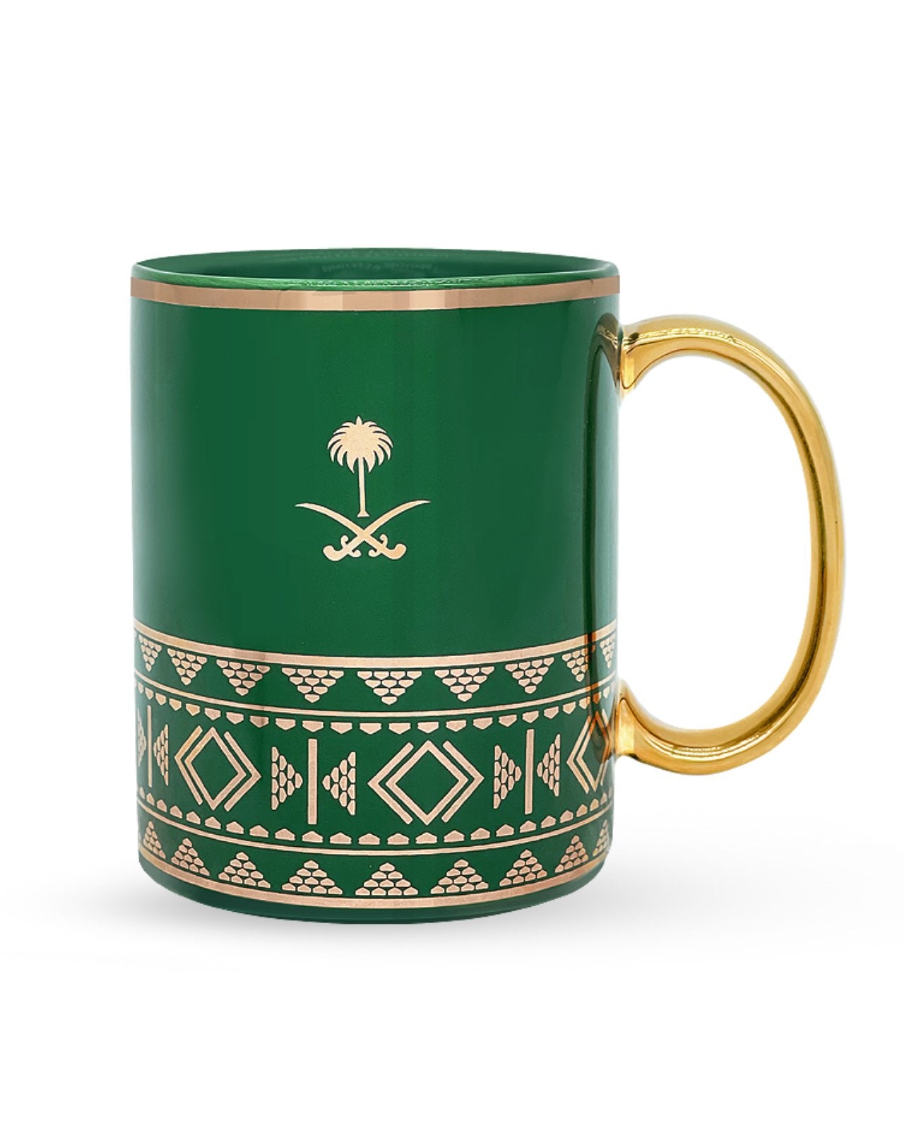 Multicolored ceramic nesscafe mug with distinctive design printed with logo of the state on the side of mug.