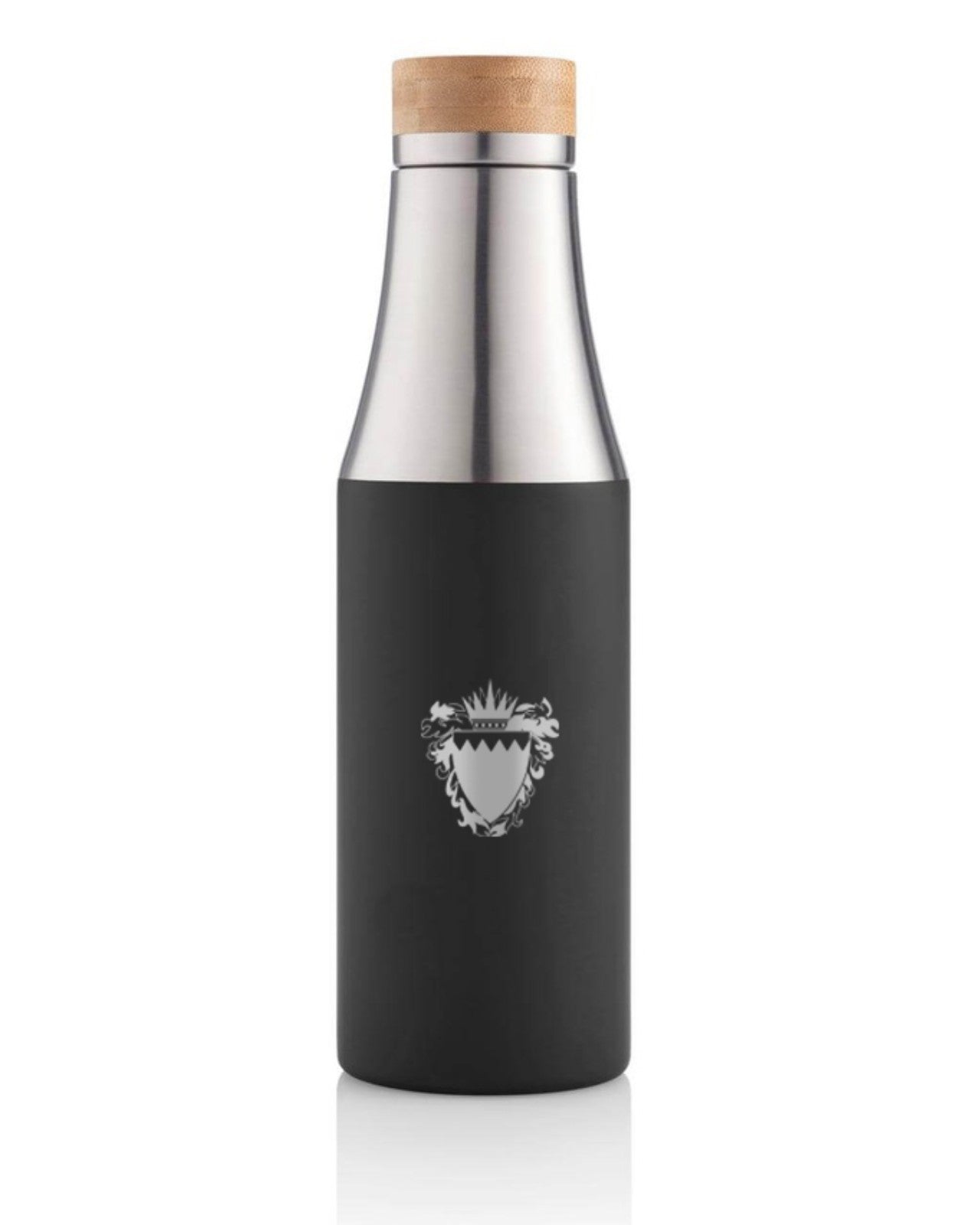 A Stainless steel water bottle with logo of the state printed on the side and Bahrain on the other.