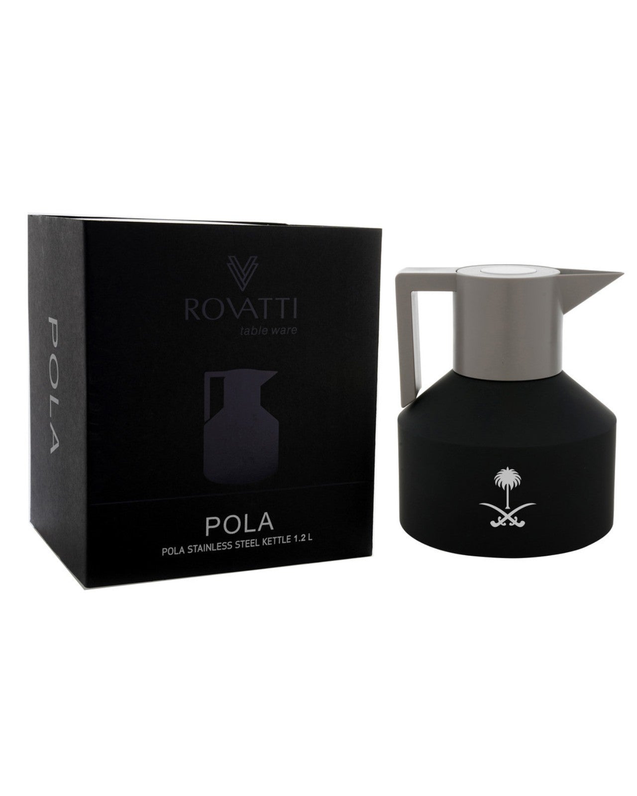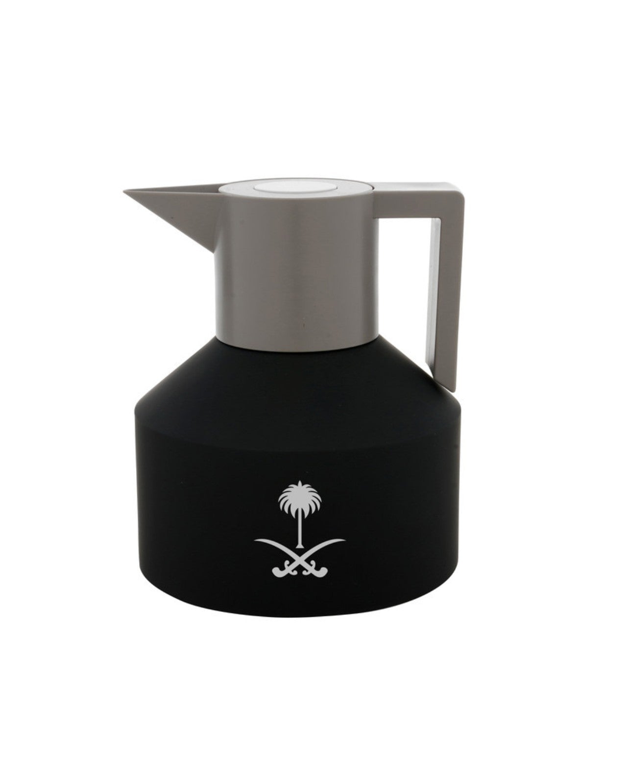 A painted double wall heat insulated stainless steel kettle with modern distinctive design and a smooth heat sealed cover. Our brand logo is engraved at the bottom and KSA state logo on the side. An option of logo or name customization is applicable on the kettle.