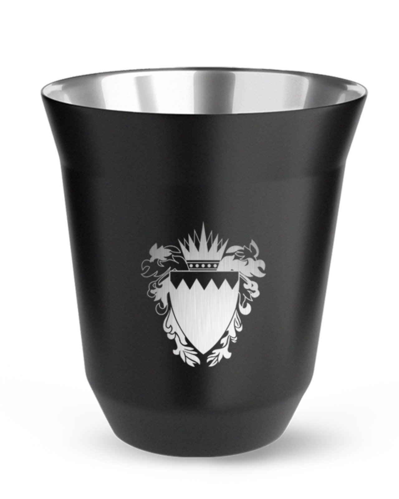 A set of two painted double layer heat insulated stainless steel cup with our brand logo engraved at the bottom and Bahrain logo on the side. An option of logo or name customization is applicable on the cup.