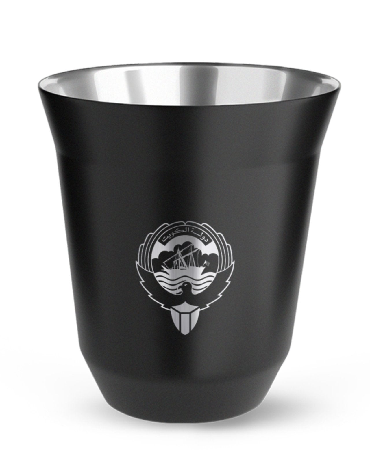 A set of two painted double layer heat insulated stainless steel cup with our brand logo engraved at the bottom and Kuwait logo on the side. An option of logo or name customization is applicable on the cup.