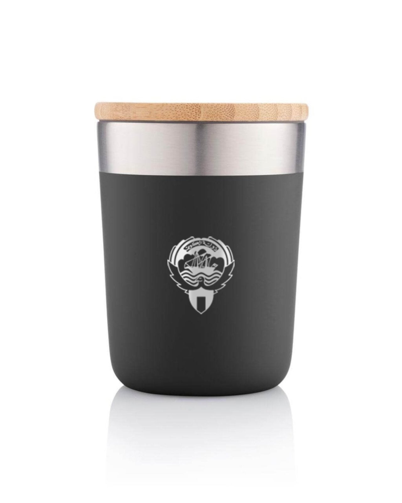A Stainless steel insulated mug with logo of the state printed on the side and Kuwait on the other.