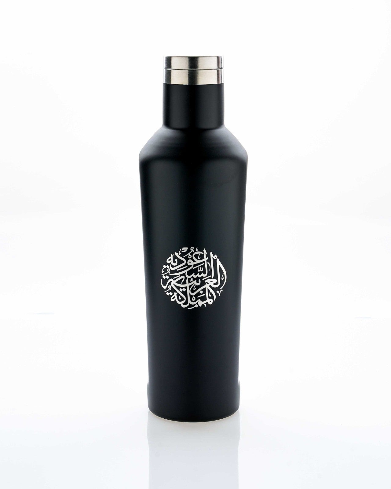 A Stainless steel water bottle with logo of the state printed on the side and KSA on the other. A removable black canvas cover with KSA logo print.