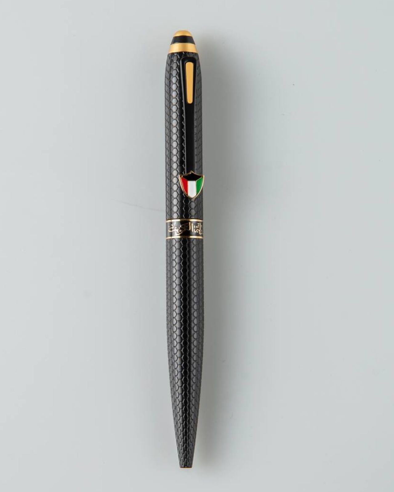 Black Rovatti collection pen with distinctive design in hexagonal shapes, engraved with state emblem on the clip, Kuwait calligraphy on the center and Schmidt's German ink is written in blue. Comes in a elegant box.
