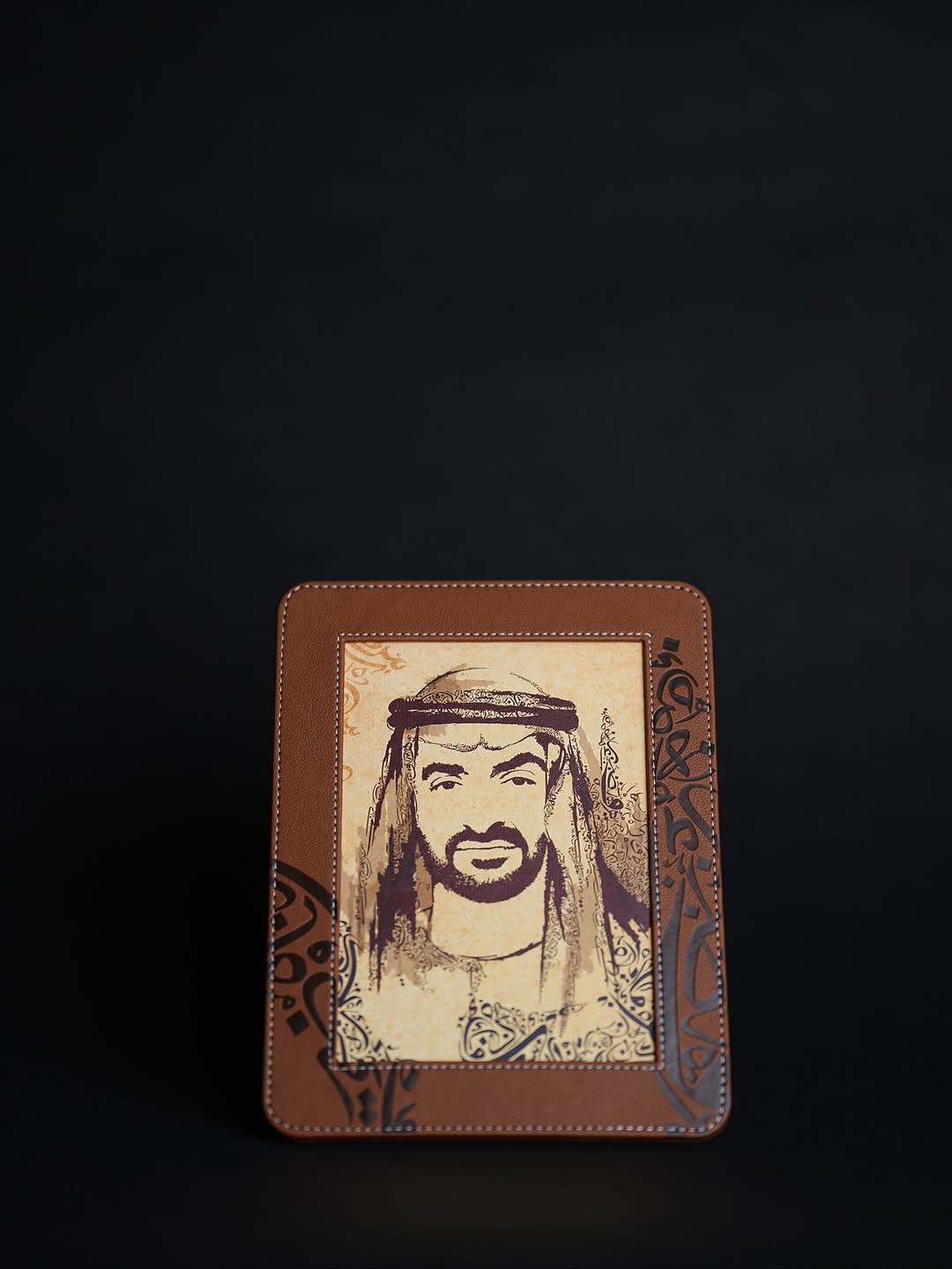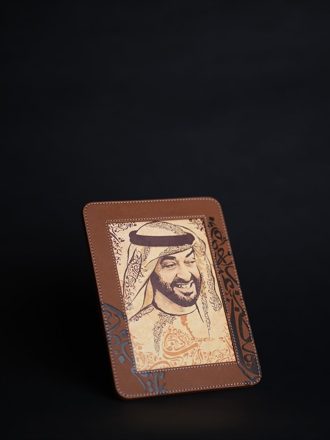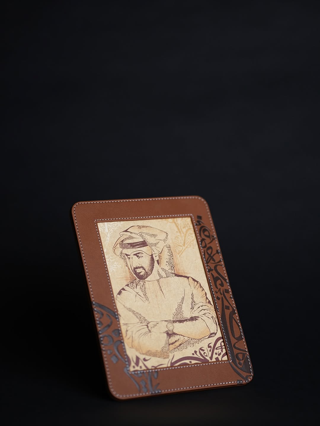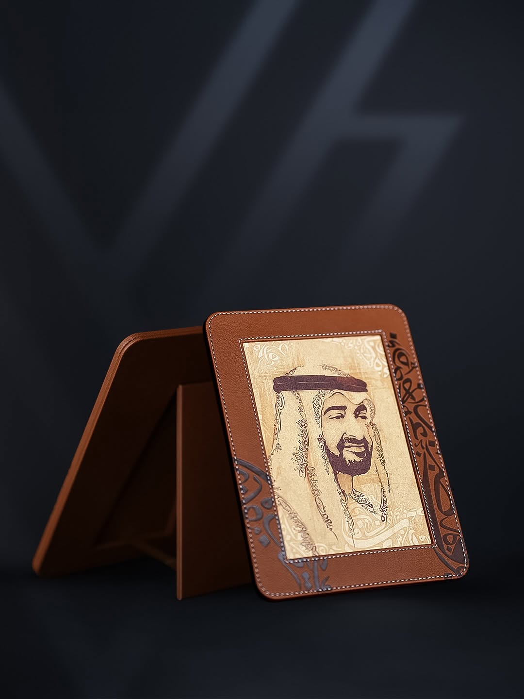 A luxurious leather frame with intricate details and elegant Arabic calligraphy, combining authenticity and high craftsmanship, making it more than just a gift… but a symbol of pride and loyalty to the nation and its leadership.