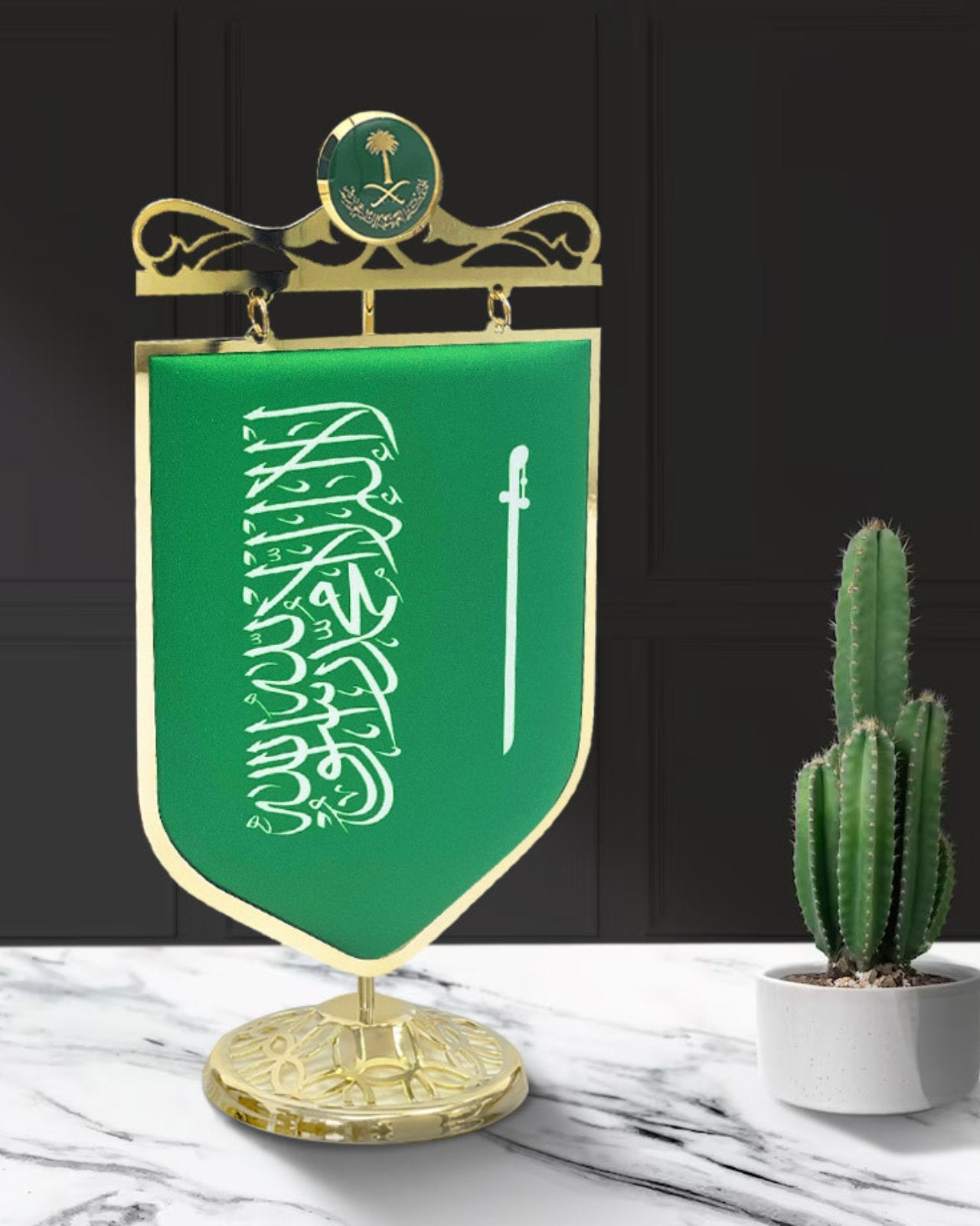 Saudi flag desktop base has an elegant and attractive design that makes it a perfect piece for any office or home. This base is of its high quality as it is made of gold-plated metal, making it look both durable and luxurious. The base includes the flag of the KSA printed on high-quality canvas with bright colors that express the spirit of patriotism and belonging to the country. At the top of the base, the Golden Kingdom logo features meticulous, sophisticated details. This product comes in a reinforced black cardboard box decorated with the national flag colors, making it a great gift for anyone who loves the KSA and is proud to belong to this great country.