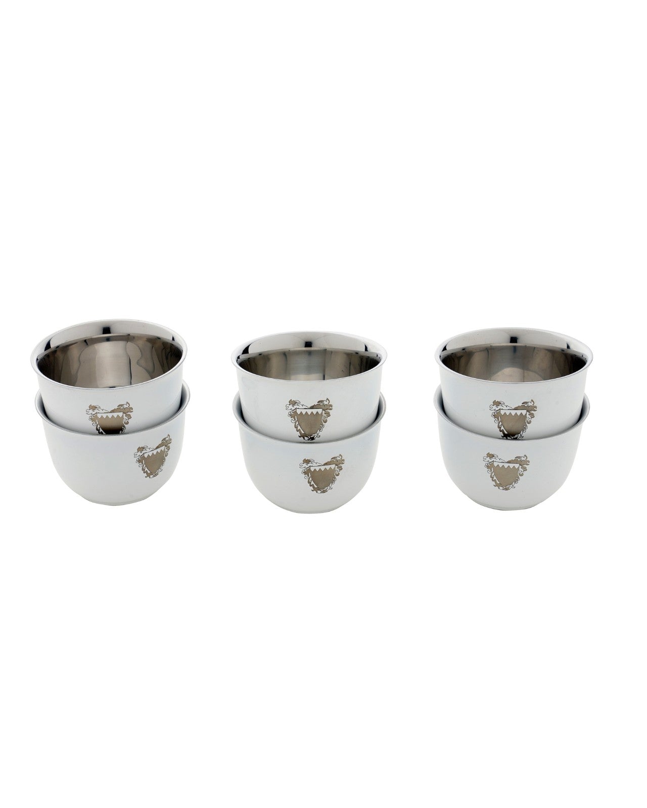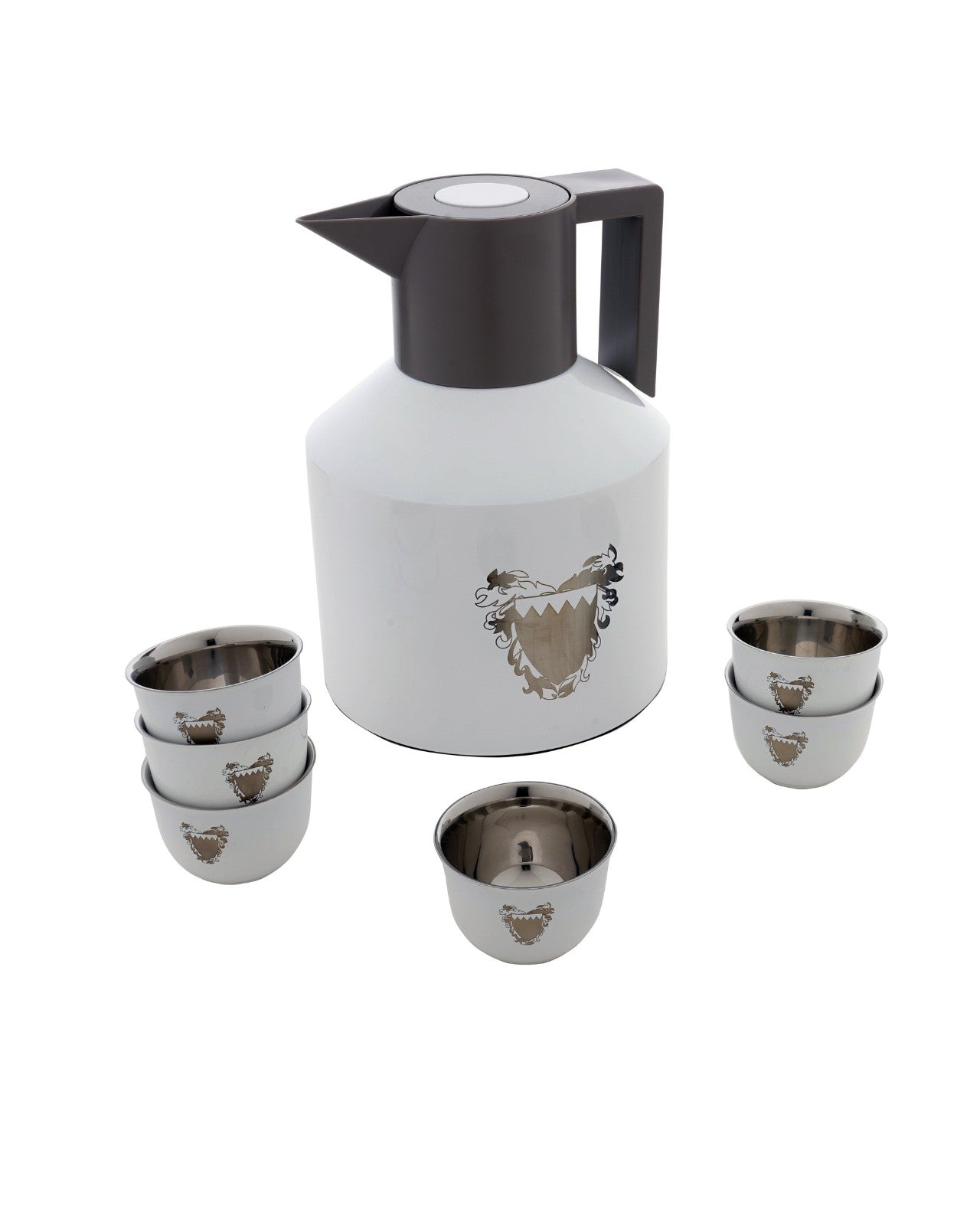 A set of six sleek painted double layer heat insulated stainless steel cup and a painted double wall heat insulated stainless steel kettle with modern distinctive design and a smooth heat sealed cover, with our brand logo engraved at the bottom and Bahrain logo on the side. An option of logo or name customization is applicable on the cup.