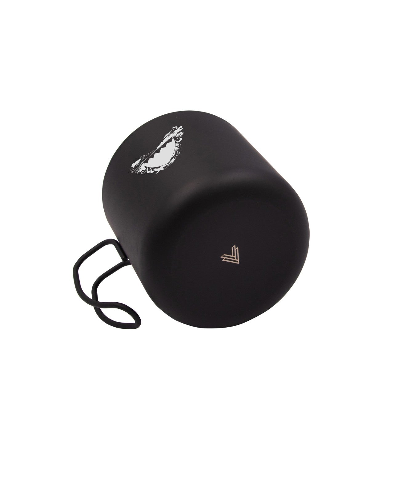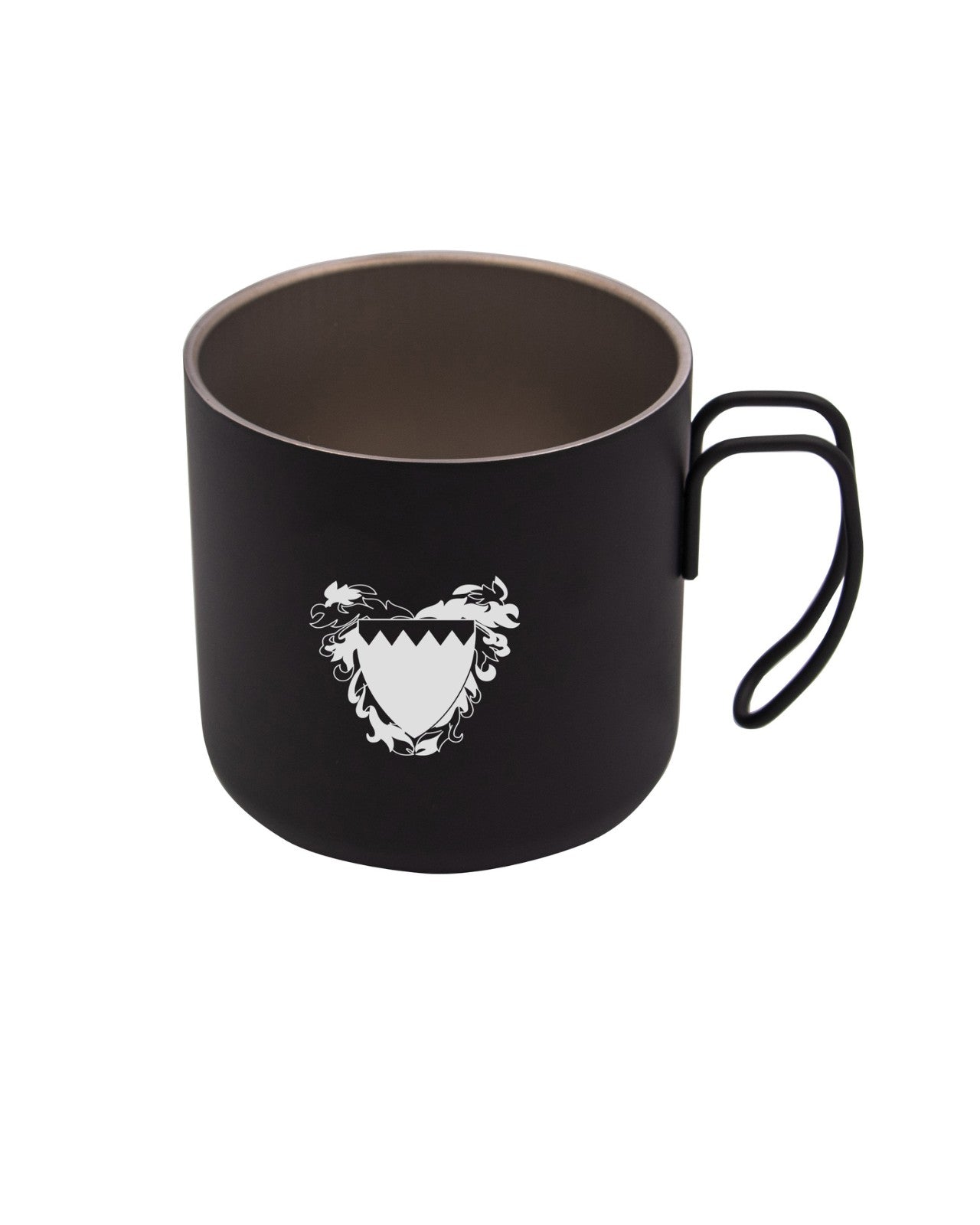 A painted double wall insulated stainless steel mug with an ear-shaped wire handle. Our brand logo is engraved at the bottom and Bahrain state logo on the side with an option of logo or name customization on the mug.