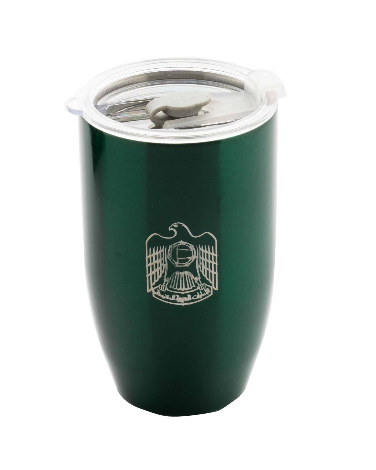 A green painted double wall heat insulated stainless steel traveling mug with transparent heat sealed cover. Our brand logo is engraved at the bottom and UAE state logo on the side. An option of logo or name customization is applicable on the mug.