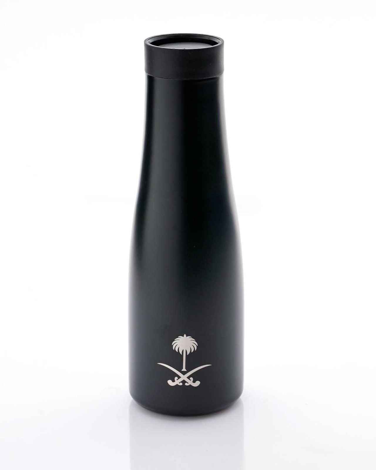 A Stainless steel water bottle with logo of the state printed on the side and KSA on the other. A removable black canvas cover with KSA logo print.