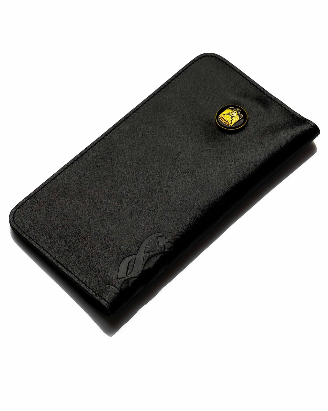 A real nappa leather women's black wallet with a metallic UAE logo in front and United Arab Emirates embossed on the other. Inside, with an additional 8 slots card holder and a phone pocket.