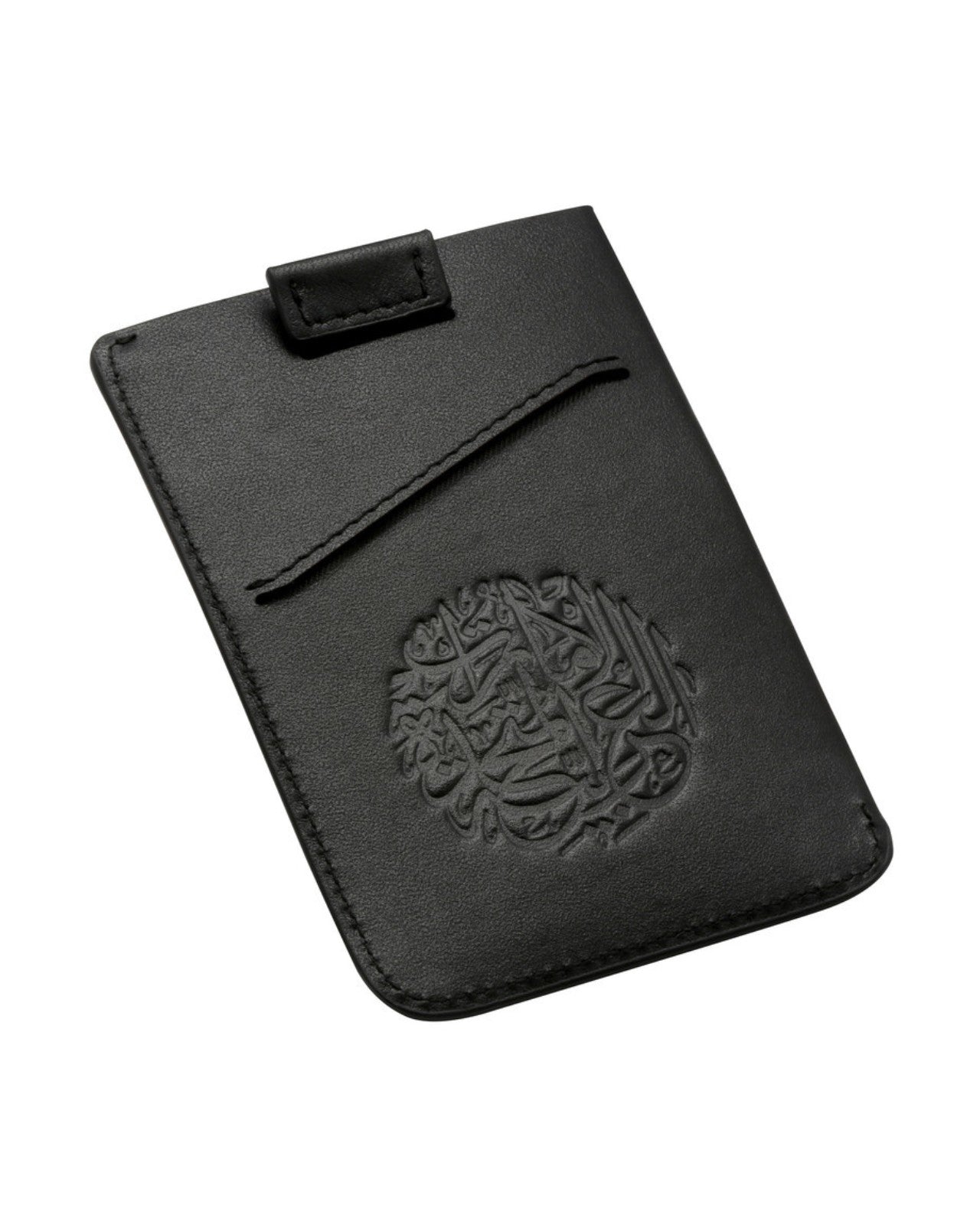 A real crazy horse leather men's black cardholder with a metallic UAE logo in front and United Arab Emirates embossed on the other. Each side has a slot for credit card and a pull up holder on top for easy money or card grip.