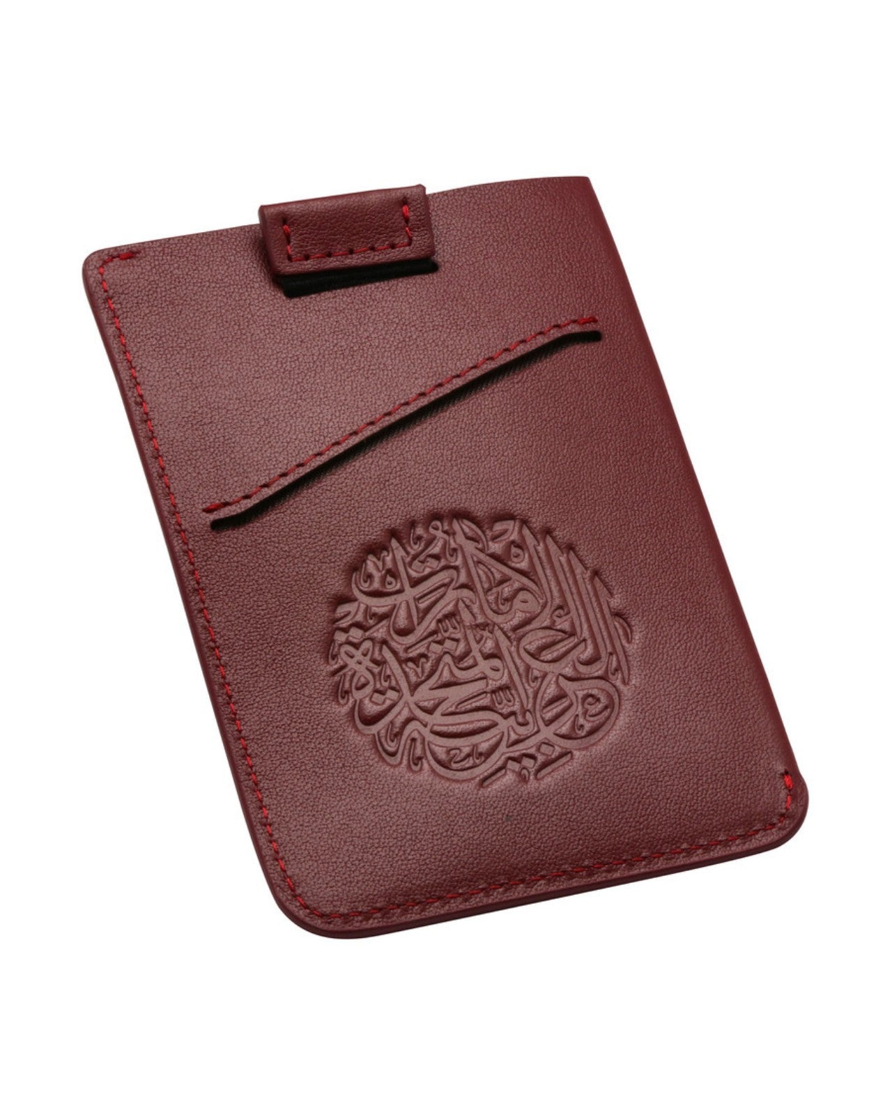 A real crazy horse leather men's Maroon cardholder with a metallic UAE logo in front and United Arab Emirates embossed on the other. Each side has a slot for credit card and a pull up holder on top for easy money or card grip.
